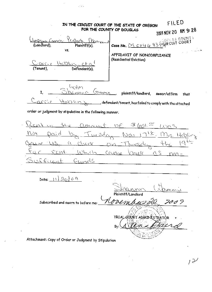 This was done when Ms. Gammie worked for her prior employer Umpqua Community Development Corporation (UCDC) as a property manager. According to Douglas County Circuit Court records, the tenant went through a court eviction case with UCDC that got settled in court. The settlement was based upon the tenant/defendant making payment to UCDC/landlord/plaintiff by a specific date. The defendant dropped off a check to cover the required payment, which was accepted by the landlord UCDC. A copy of the check is attached.